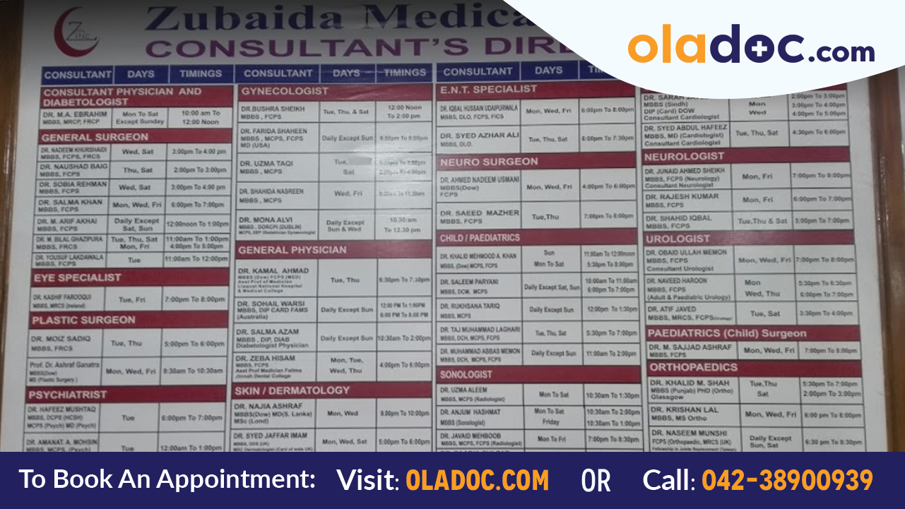 To Book, an appointment with any of the doctors at Zubaida Medical Centre, Karachi, call on 02138140600 or click the “Book Appointment” button.
